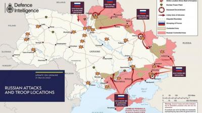 В оборонном британском ведомстве отметили, что за более чем месяц полномасштабной войны в Украине российские войска контролируют только отдельные пути, а не территории.