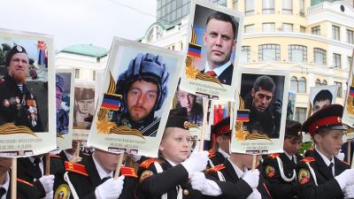 В неподконтрольном Украине Донецке во время шествия так называемого «Бессмертного полка» пронесли десятки портретов убитого 31 августа 2018 года экс-главаря ОРДО Александра Захарченко.